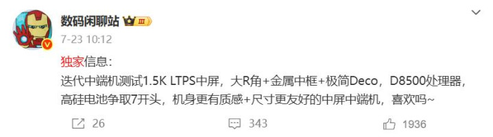 近期有一款搭载天玑9400+处理器的高性能中端机官宣,将会在几天后发布,就是iqoo z10 Turbo+,目前配置已经被爆料的差不多了,这大概是版本迭代之前中端市场的最后一次内卷,性价比会拉的很满。